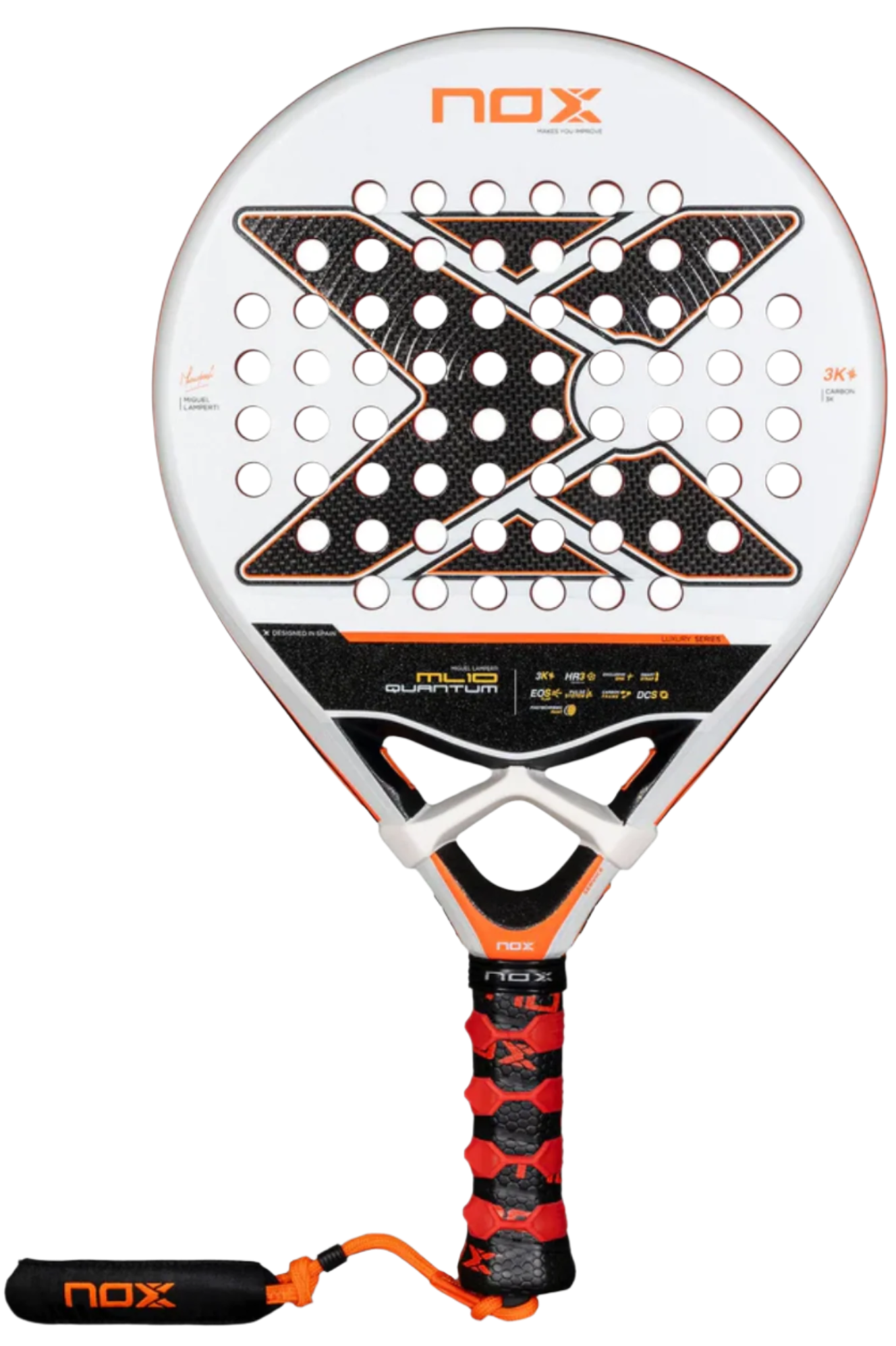 La nueva ML10 Quantum 3K conserva la icónica combinación de materiales de sus predecesoras: fibra de carbono 3K y la clásica goma HR3 de NOX, la preferida de Miguel Lamperti, con la incorporación del cambio de color Eva. Una pala “plug and play” de fácil adaptación, con un tacto intermedio característico de las palas NOX. Incorpora la tecnología EXCLUSIVE SPIN, con doble acabado rugoso: 3D hexagonal en el centro y textura de arena en el resto. Esta combinación mejora el control y permite añadir más efecto a la bola.